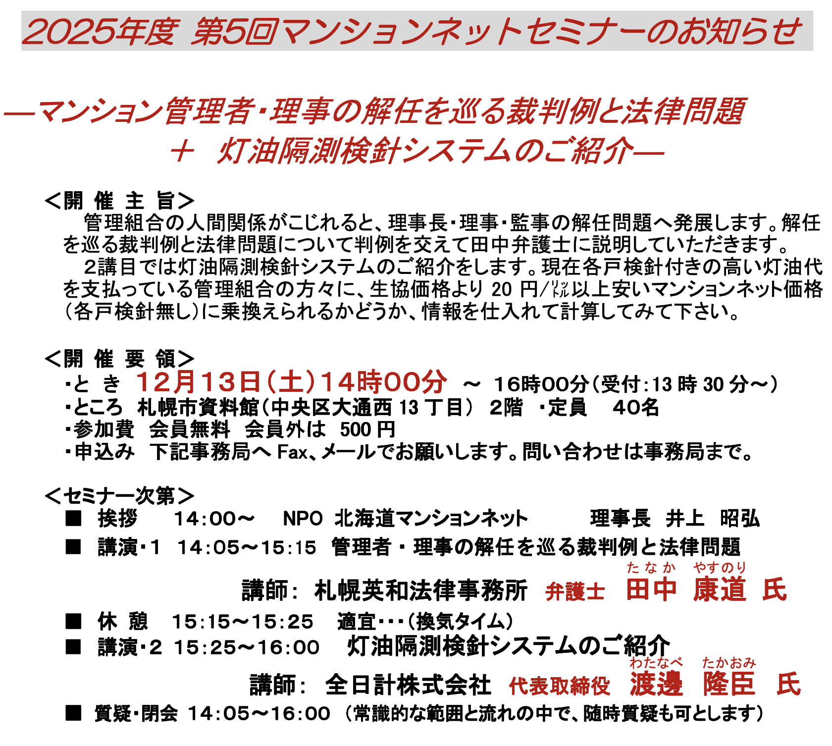 条件:市内のガソリンスタンド・燃料店(100店舗)を対象(多量配達1リットル当たり税込み価格)🔸 安定・安価な灯油調達の取り組み 当法人では、公正で客観的な情報提供の一環として、参加する会員マンション管理組合が連携し、そのスケールメリットを活かして灯油を安価かつ安定的に調達する共同事業を推進しています。 価格決定に当たっては、札幌市から毎月公表される「灯油の市場価格帯(札幌圏)」を基に、納入業者と詰めの交渉を通じて、できる限り「安価な価格」での購入を目指しています。 昨今、灯油価格が高止まりするなか、安心・納得の価格での安定供給をめざしています。当北海道マンションネット会員であれば事業参加が可能です。 詳しくは「北海道マンションネット事務局」にご相談ください。 🔸 昨年度の実績(2024年度) ア)参加管理組合数:36管理組合(前年度 35組合) イ)年間給油量(合計):約1,400キロリットル(同 1,350キロリットル) ウ)1組合あたりの平均給油量:約39キロリットル(同 38キロリットル) エ)年間給油量(合計):約1,400キロリットル(同 1,350キロリットル)